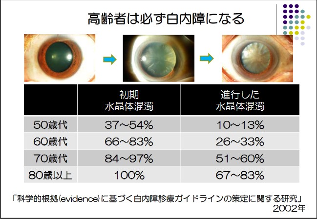 手術が必要かどうかは、「白内障は手遅れになる病気ではないので、急いで手術を受ける必要はありません。……ご本人が生活上、不便を感じるようになったときが、手術を受ける時期になります」(いつ手術を受けたらいいの? 日本眼科医会)から、患者自身が決めることと言えそうです。 私の場合は、眼軸が異常に長い強度の近視だったので、眼内レンズにすることにより、視力が格段に改善しました。うまい具合に白内障になったし、もっと早く手術をすれば良かったとさえ感じています。 しかし、眼軸が通常の長さなら遠くは良く見えているし、老眼になっても水晶体の調整力が全く失われるわけではありません。軽い白内障になったとしても、水晶体の方が眼内レンズより優れています。本当に「生活上、不便を感じるようになった」かを、十分に検討してから手術するかどうかを判断すれば良いと思います。白内障手術では、結局は水晶体を取り去ってしまうのですから、手術が遅くなったからといって手遅れになるということはありません。 点眼薬には、「科学的根拠がない」? 白内障の進行を遅らせる点眼薬については、2003年に「科学的根拠がない」とする次のような新聞報道がなされ、話題となりました(白内障の点眼薬 問題)。