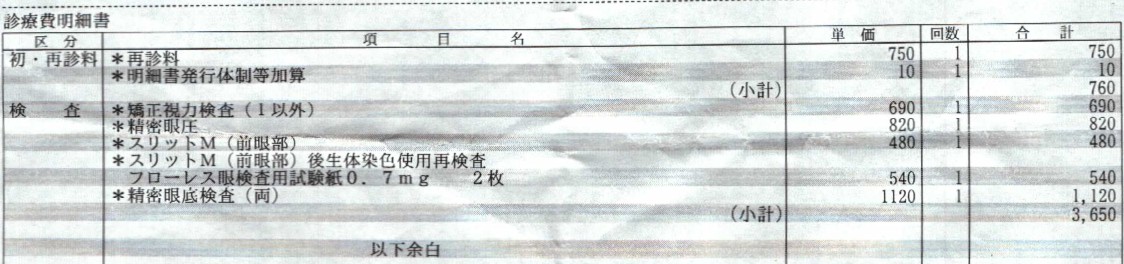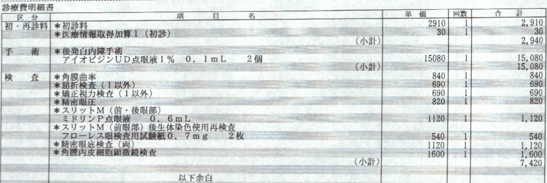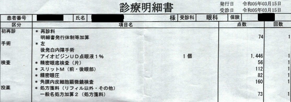 後発白内障はレーザーを使って濁りを取ることで治療できます(後発白内障 - 徳島県医師会Webサイト)。混濁した上皮細胞と一緒に水晶体囊も取り去ります。取り去るのは中央部分だけです。物を見るのに使うのは中央部分だけですから、周辺部分に混濁した上皮細胞が残っていても問題はありません。周辺部分の水晶体囊は残っているので眼内レンズを固定することができます。中央部分には水晶体囊がなくなるので、混濁した上皮細胞が進入することはありません。 ![]() 2023年3月15日に受けた左目の後発白内障手術の診療費の明細は次のとおりです。点数1点につき10円です。手術費用は1万4460円で、検査費、再診料、処方箋料合わせて、総額2万30円でした。3割負担なら自己負担は6009円となります。 ![]() 2024年10月17日に受けた右目の後発白内障手術の診療費の明細は次のとおりです。手術費用は1万4460円で、検査費、初診料合わせて、総額2万5440円でした。3割負担なら自己負担は7632円となります。 ![]() 2024年10月25日に受けた術後検査の診療費の明細は次のとおりです。検査費、再診料合わせて、総額4410円でした。3割負担なら自己負担は1323円となります。 ![]() 眼底検査は、様々な検査の総称です( 眼底検査について|よりみつ眼科)。 医療機関が適正な診療費を請求しているかは、審査支払機関が審査します(診療報酬の審査制度|国民健康保険中央会)。 ![]() 眼科医会では「患者の病状と主訴に基づいた必要最小限の検査をするように心がける」よう呼びかけています( 保険診療=制限診療 - 和歌山県眼科医会)。 簡単な視力検査は、簡易式視力表を使えば自分でできます。 粘弾性物質の残存が影響 白内障手術では粘弾性物質を注入しますが、粘弾性物質が囊内に残ると前囊収縮と後発白内障が発生しやすくなるという実験研究報告があります(術後囊内残存粘弾性物質と前囊収縮・後発白内障)。 実験では、日本白色家兎を5羽用意し、両眼に眼内レンズを挿入し、片眼は粘弾性物質を完全に吸引除去し,もう片眼は前房中の粘弾性物質のみ吸引除去し,囊内の粘弾性物質は残存させました。前囊収縮を比較するために、術後1週間と術後3週間に前眼部徹照像を撮影し、後発白内障は術後3週で眼球を摘出し組織学的に解析しました。 その結果、前囊切開窓面積は、粘弾性物質を残存させた眼では、術後3週間で半分ぐらいまで縮小しています。粘弾性物質を完全に吸引除去した眼では、逆に少し拡大していますから、粘弾性物質の残存は、前囊収縮の発生を促したものと推測されます。 ![]() 一方、後囊中央部の組織厚は、粘弾性物質を残存させた眼では、粘弾性物質を完全に吸引除去した眼に比べ、4倍近く増えています。後発白内障においても、粘弾性物質の残存は、顕著な影響を及ぼしています。 ![]() これらの結果について、この研究報告の筆者は次のように分析しています。