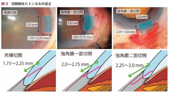 このように、「創傷治癒が大変遅い」ということは分かったのですが、ではどれぐらいの期間がかかるのかというと、ネット上では具体的な情報は見つかりません。 ただ、「砂ぼこりなどで目が汚れる可能性がある競技や、目を打撲する可能性がある競技は、1か月は控えてください(7.仕事・運動はいつからできますか? | 公益社団法人 日本眼科医会)」ということですから、1ヶ月経てば打撲にも耐えうるまで十分修復するといえそうです。 術後眼内炎は医療ミス? 白内障手術における、角膜の切れ目の入れ方は次のようになっています(白内障手術パーフェクトマスター)。切開の方法は2種類あり、角膜切開(左)は黒目と白目の境目から斜めに切れ目を入れます。強角膜切開(中央と右)は白目から斜めに切れ目を入れます。角膜切開は角膜の切れ目が露出することになりますが、出血はありません。強角膜切開は角膜の切れ目が露出しませんが、出血することがあります。私の場合、手術後に白目がかなり充血していたので、強角膜切開だったのかもしれません。いずれの方法でも、眼圧で傷口が押さえられるので、縫合の必要はありません。 ![]() 角膜の表面は涙で覆われていて、「涙にはリゾチームという殺菌作用をもった物質が含まれており、微生物の侵入や感染を予防する働きをします」(涙の働きと構造|大塚製薬)。 手術後に細菌やウイルスが侵入する可能性があるのは、角膜の切り口からですから、角膜上皮が修復されれば危険はなくなると思われます。そこで、「手術後の感染症を防ぐため、術後1週間の洗顔・洗髪は控えてください(白内障手術を受ける方へ 知っておきたい白内障術後のケア)」と指示されます。 細菌やウイルスが侵入すると「急激な視力低下、霧視、眼痛を自覚し、充血」が起こりますから(感染性眼内炎)、患者自身が異変に気づくはずです。術後の眼内炎は、2000から3000例に対して1件の割合で起き、手術中に強毒菌が侵入して炎症を起こすものだそうです(術後眼内炎とは)。つまり、この説明からは、術後眼内炎は角膜の切り口から細菌が侵入することにより引き起こされるものではないということになります。手術中は、開いた切り口から器具を挿入するのですから、手術後の切り口が閉じた状態より、格段に危険度が増すことは容易に想像できます。